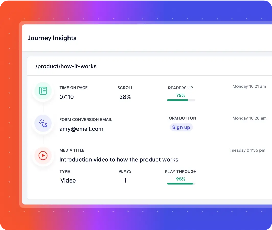 Get answers by seeing the full journey of every conversion: topics read, videos watched, sources, campaigns, every touch point!